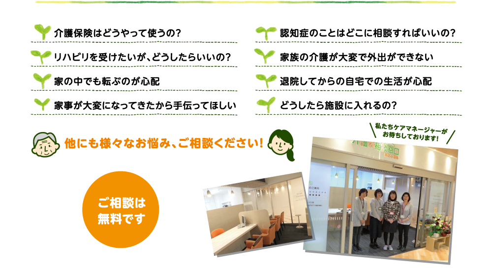 介護保険や高齢者の制度に詳しいケアマネジャーが相談をお受けする窓口です。 ケアマネジャーは、介護認定を受けた方々のサービス計画を作成したり、事業所との連絡調整など、介護保険制度に関わる仕事を行いますが、介護の相談窓口では、介護保険の利用の有無に関わらず、加齢のために起こる様々な不安やお悩みについてご相談を受け、一緒に考え、健やかで明るい毎日を過ごせるようお手伝いをしていきます。 相談料金は一切かかりませんので、お気軽にお立ち寄り下さい。